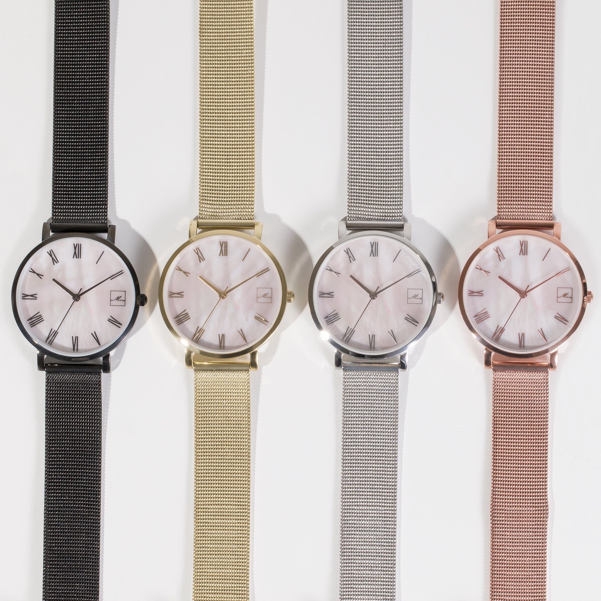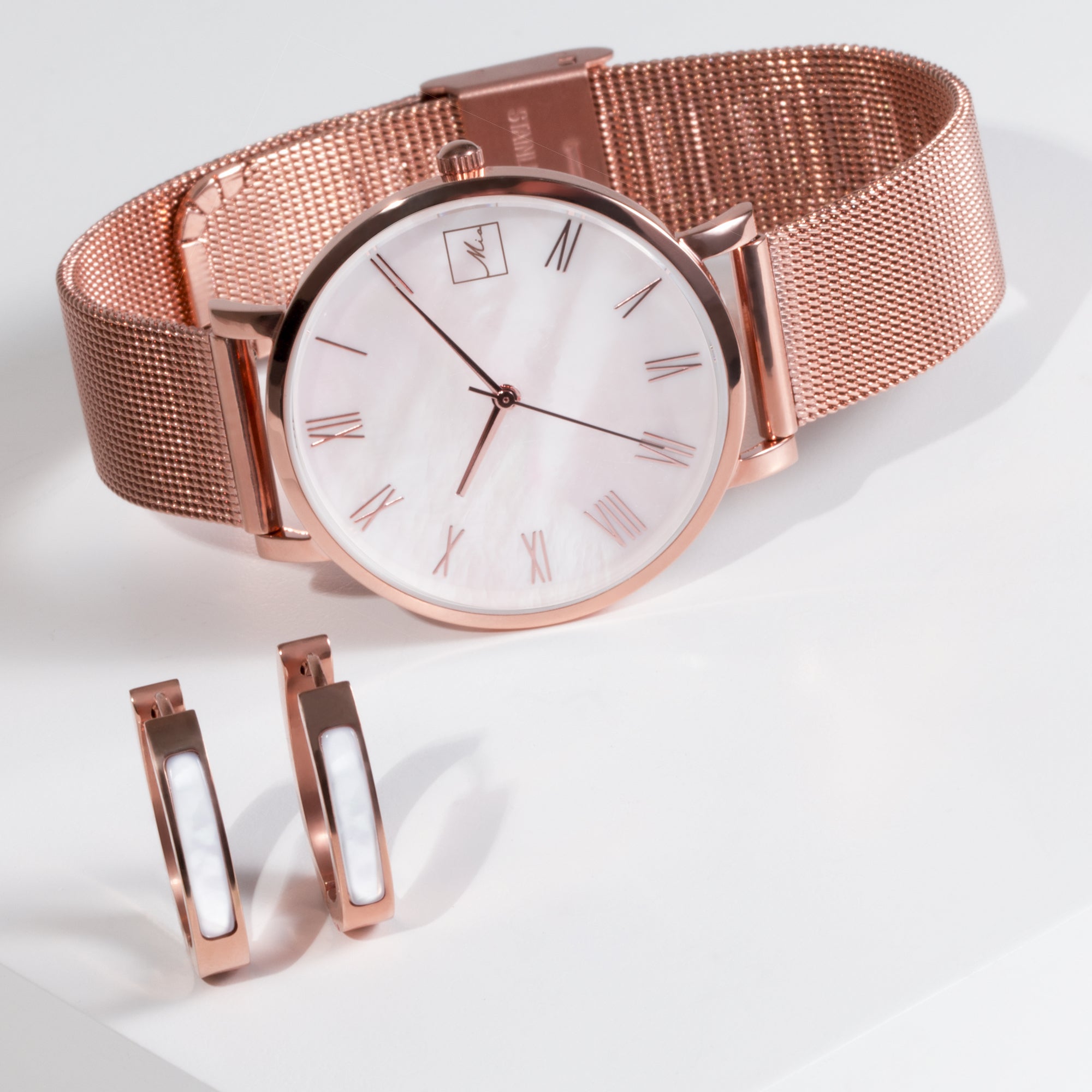 AdjustableHypoallergenicRose gold PVD platingLight pink mother of pearl dial